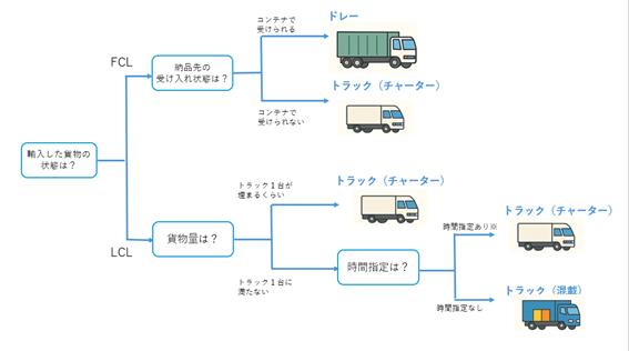 そうだ。LCLで輸入した場合や、受け入れ先にコンテナが入らない場合はトラックに積み替えて運ぶんだ。