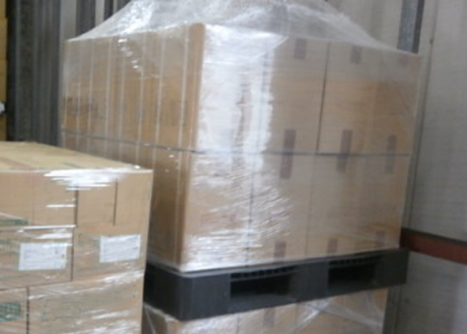 カートンや小箱をパレットに積み、ストレッチフィルムで固定。フォークリフトでの作業効率が高く、CFS倉庫での荷役にも適している。