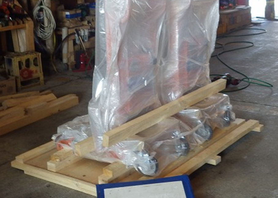 木製の腰下(スキッド)の上に貨物を載せて固定。