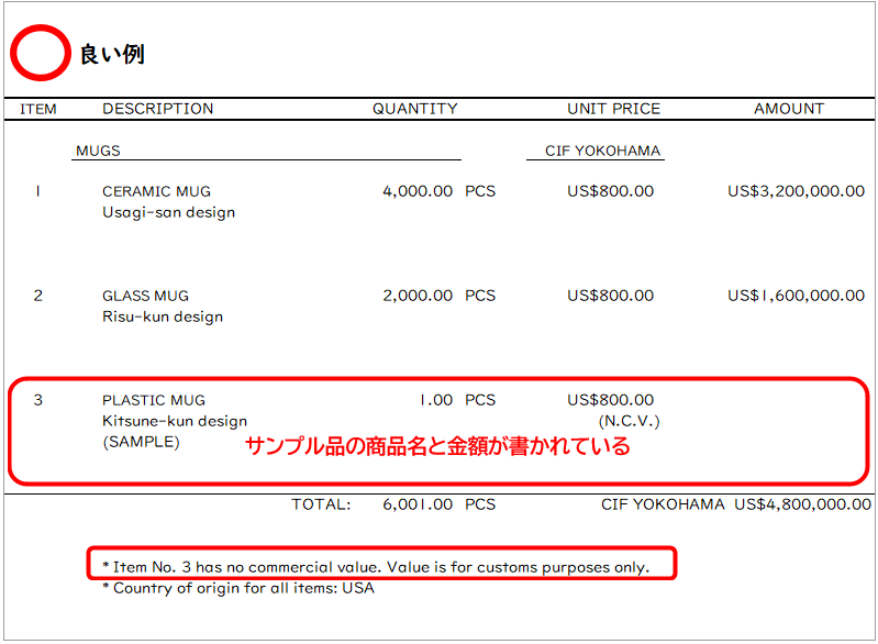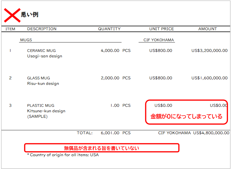 このように、サンプル品であっても品名をきちんと書いて、無償品であっても「0円」ではなく金額を書くことが重要じゃ
