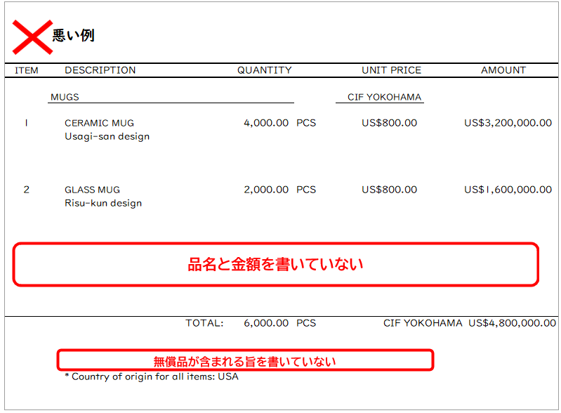 後で通関士や税関が困ってしまうから、最初から分かるように金額を記載しておくべきじゃの
