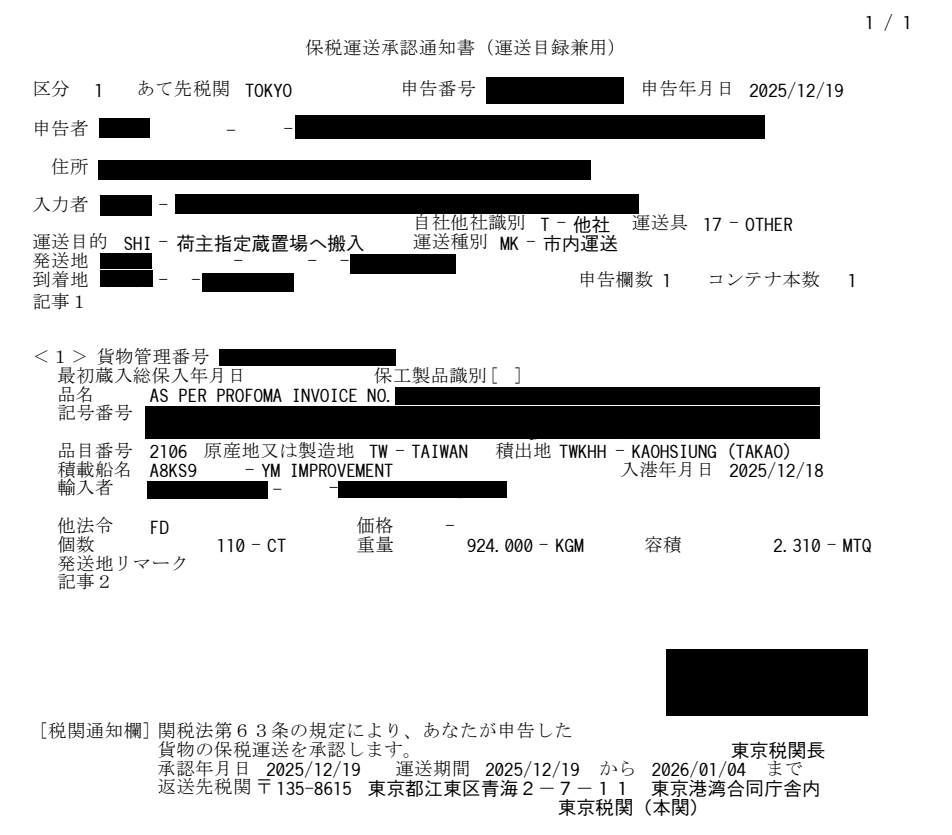 運送目的・船名・数量……発送地や到着地なんかも税関に伝えないといけないんですね。